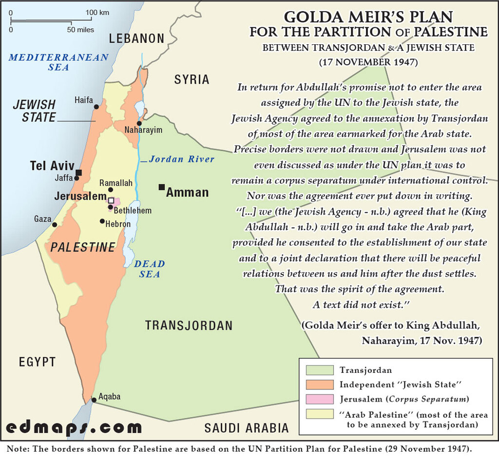 In November 1947, Golda Meir, then head of the Jewish Agency’s Political Department, met King Abdullah I of Transjordan at Naharayim, a location on the Jordan River, to discuss the impending United Nations partition plan for Palestine. This plan, voted on November 29, 1947, proposed creating separate Jewish and Arab states. During the meeting, Abdullah expressed alignment with Zionist interests, promising not to join Arab states in attacking the proposed Jewish state. He aimed to annex the Arab-designated areas of Palestine to expand his kingdom, a plan Meir did not oppose if it ensured peace. However, he suggested the Jews accept autonomy within an enlarged Jordanian state, which Meir firmly rejected, insisting on the establishment of an independent Jewish state and, as an act of goodwill intended to improve relations and communication between Arabs and Jews in the Middle East, the annexation of Arab Palestine by Transjordan.
