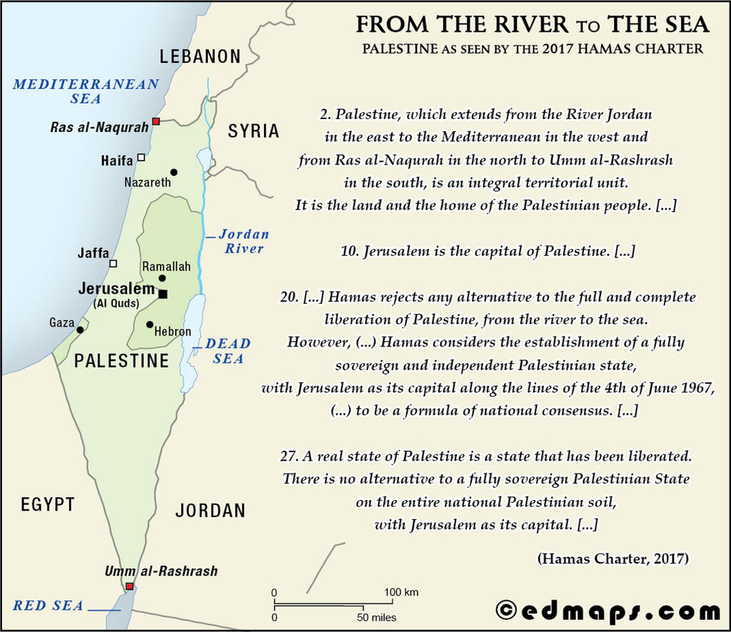 "From the river to the sea" — this phrase encapsulates Hamas's territorial vision in its 2017 charter, defining Palestine as stretching from the Jordan River to the Mediterranean Sea. Despite rhetorical modifications from 1988, the charter maintains maximalist claims over historic Palestine, encompassing present-day Israel, the West Bank, and Gaza. Hamas designates Jerusalem as Palestine's capital, declares Israel's establishment "entirely illegal," and demands "full and complete liberation." While acknowledging potential interim arrangements on 1967 borders, the charter preserves the ultimate objective of eliminating Israeli statehood, rejecting all partition plans and international frameworks that legitimized Israel's existence, leaving no basis for permanent coexistence or compromise.