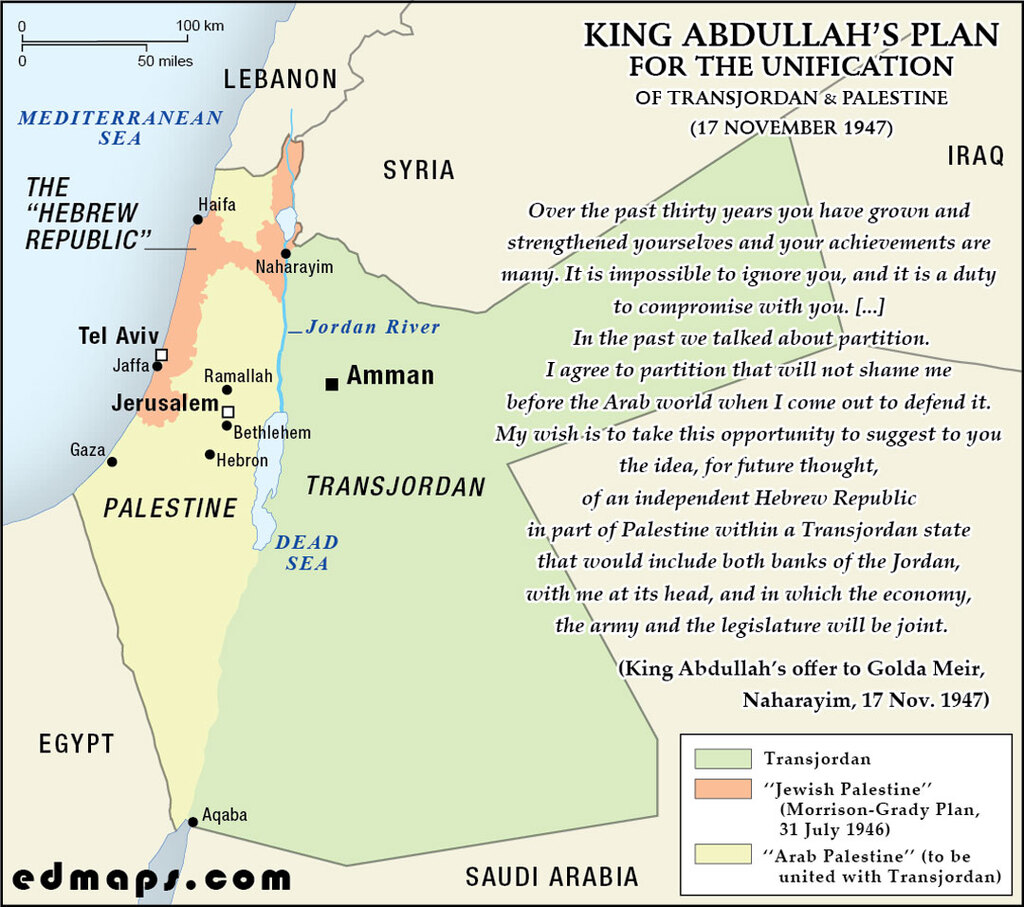 Abdullah engaged in secret talks with Zionist leaders, notably Golda Meir, in 1947–1948, to avoid conflict and negotiate territorial arrangements. In a November 1947 meeting, Abdullah proposed an autonomous ''Hebrew republic'' within a Hashemite kingdom, suggesting that Jews could have representation in his parliament without immediate statehood, but Golda Meir rejected this, insisting on the UN Partition Plan’s provision for a Jewish state.